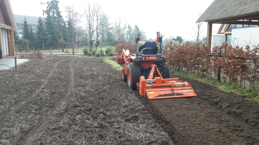Na het frezen en spitten egaliseren we de grond grof. Vervolgens verrijken we de bodem met hoogwaardige champost of een bodemverbeteraar, zoals Vitaterra of Ecotop Solide. Dit zorgt voor een sterke grasmat, een gezond bodemleven, houdt het vocht beter vast in de bodem en laat het graszaad extra snel ontkiemen.